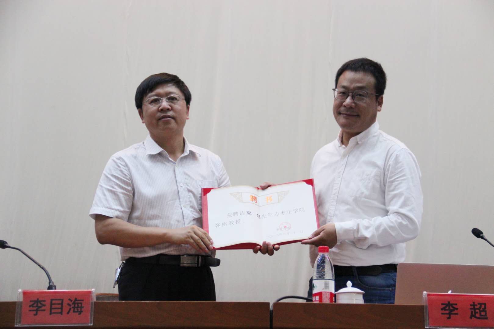 在报告会上,李目海为李超颁发客座教授聘书。其后,山东师范大学新闻与传媒公司教师、中国齐鲁文化促进会文学部副主任李超老师作了题为《创意思维与认知提升》的学术报告。作为山东省首批签约文艺评论家、山东电影审查委员会委员、山东省广电局特邀调研专家,李超老师长期从事影视艺术及其产业化研究,为十余部影视作品担任文学策划,其策划并主演的电影《大火种》获得2017年山东省精品文艺工程奖,策划的多项影视节目和影视剧被评为山东省广电局重点影视产业项目。他的报告,讲解深入独到,既充满真知灼见,又饱含艺术实践经验;他以生活中、影视艺术中鲜活的案例,深入阐发了创意、创意思维及自我认知,并勉励同学们要好好认识自我,好好提升自我,好好规划自我,好好成就自我。