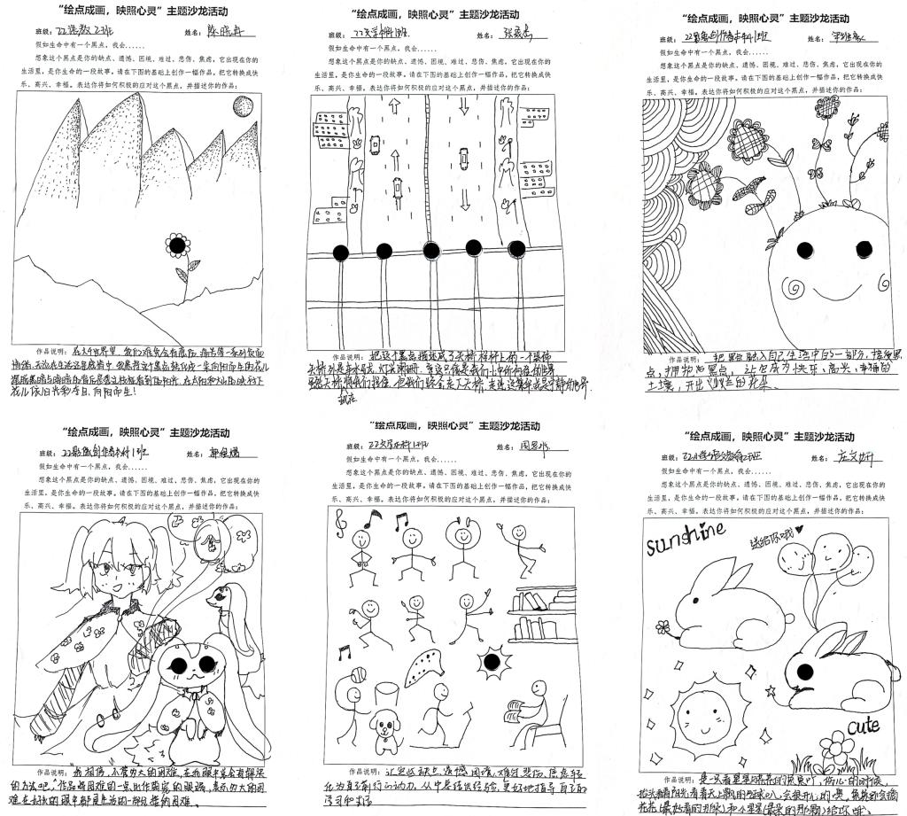 本次活动,公司从2021、2022级抽取部分不同性格的同学,以“假如生命中有一个黑点,它们代表缺点、遗憾等,如何在此基础上,转换成快乐与幸福”为题,在舒缓的背景音乐下同学们以自己的所思所想所悟进行创作,通过点线面等艺术表现形式将思想具象化到纸面上。在互动环节中,同学们通过分享彼此画作的创作理念,更好的了解了性格迥异同学们的多角度思维方式,更多面化的认识了自己。正如同学们的作品中所述“走过阻碍前行悲伤难过的天桥,我们终会走进向往的宁静或繁华的世界。”