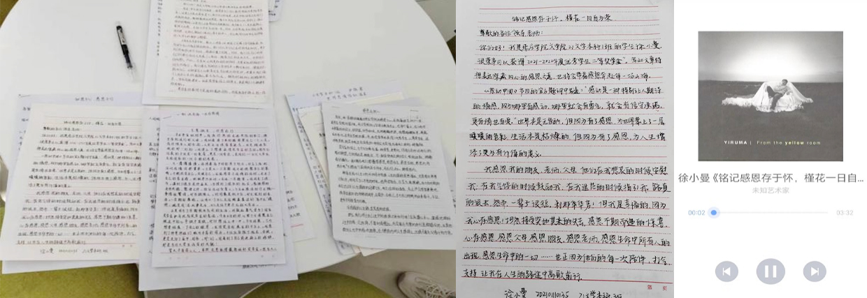获得奖学金、助学金的同学以手写信和朗诵的形式,用真挚的情感手写信件,饱满的感情朗诵,感恩父母、公司、社会与国家。行行情真意切的文字,恰是幅幅感人至深的生活剪影,句句情感饱满的言语,是永怀感激的心灵迸发。活动共收到56份投稿,在同学们的投稿中写到,奖学金、助学金的支持不仅是物质上的,也是精神上的鼓励和鞭策,还传递着国家的责任感和社会的公德。作为新时代老员工,要感恩父母、公司和社会,领悟其蕴涵的精神实质,常怀感恩之心,常言感恩之情,常做感恩之事。许多同学在信中郑重承诺,在今后的学习生活中积极参加公司、社区志愿者活动,用实际行动回报社会,传递爱心,努力成为立大志,明大德,成大才,担大任的时代新人。