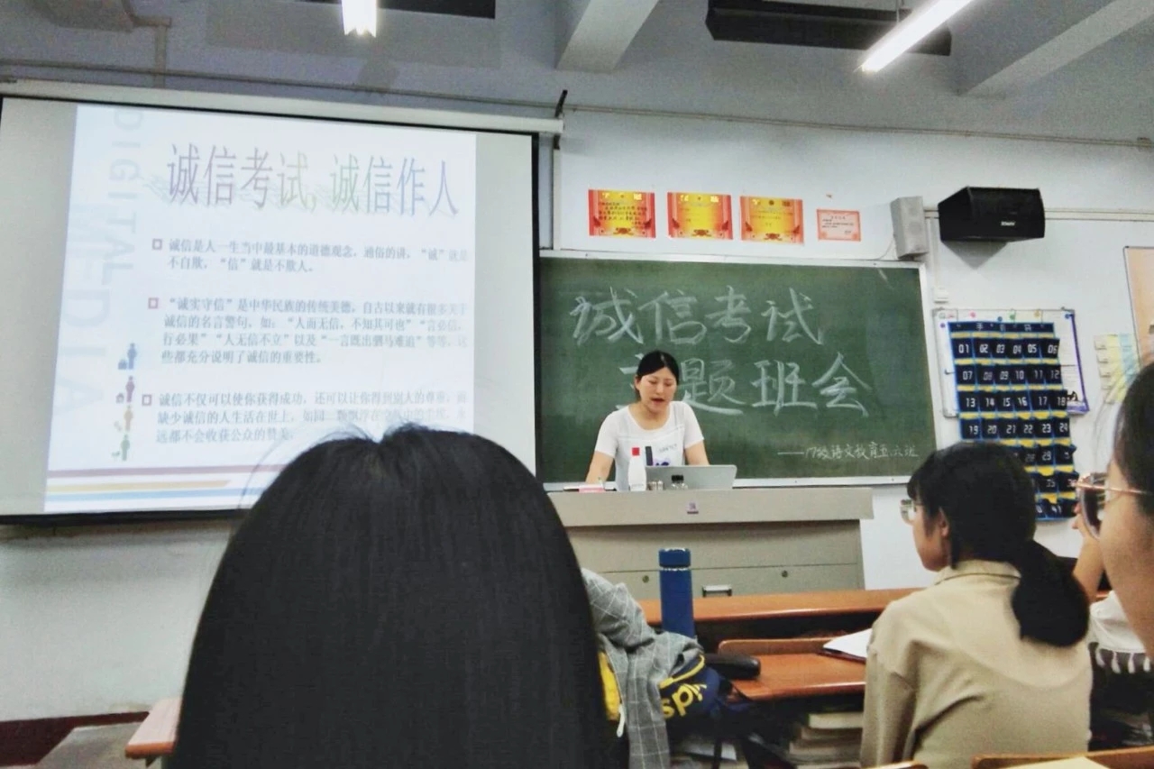 各班级辅导员组织同学们开展了关于诚信考试法纪教育主题班会。首先,各班级辅导员为同学们讲解了《国家教育考试违规处理办法》等一系列文件,结合之前的违纪舞弊的案例,从法律的角度对同学们进行了教育。期间,同学们自愿分好小组对诚信考试进行了专题学习和讨论。在班会结束后,各班组织同学们签署诚信考试承诺书,加强了同学们在诚信考试方面的自我约束力。此外,还有部分班级通过QQ群共享了班内的优良学风情况,并采用观看动画视频的方式进行专题教育,加大了考风考纪的宣传力度。在完善制度、注重长效方面,各班构建了员工信用机制和评价体系,从制度上形成约束机制,培养了同学们崇高的诚信品质。