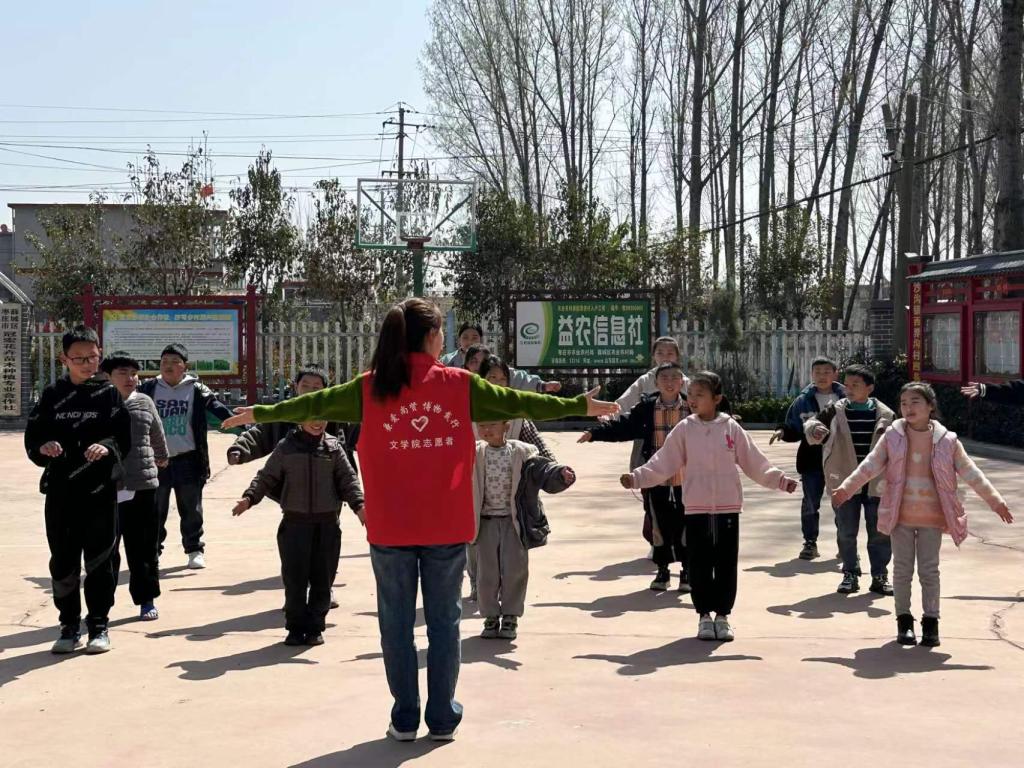 在薛城区团区委副书记孙萍、沙沟镇团委书记黄荣丽等的指导下,志愿者们和村里的孩子们一起进行了“诵读传古韵,经典润人心”经典诵读活动,一同感受中华文化的博大精深。在“大手拉小手,爱心助成长”课后辅导中,志愿者们采取结对方式为孩子们答疑解惑,帮助孩子们树立正确的学习态度、培养良好的学习习惯。在寓言故事分享环节,通过生动有趣的故事,孩子们在轻松愉快的氛围中领略到生活的智慧和人生的真谛。志愿者和孩子们还一同进行了“切水果”“捕鱼大赛”等娱乐活动,现场其乐融融。