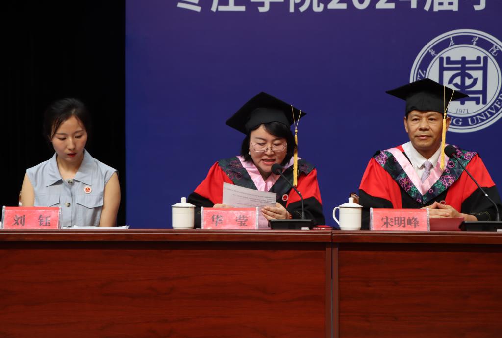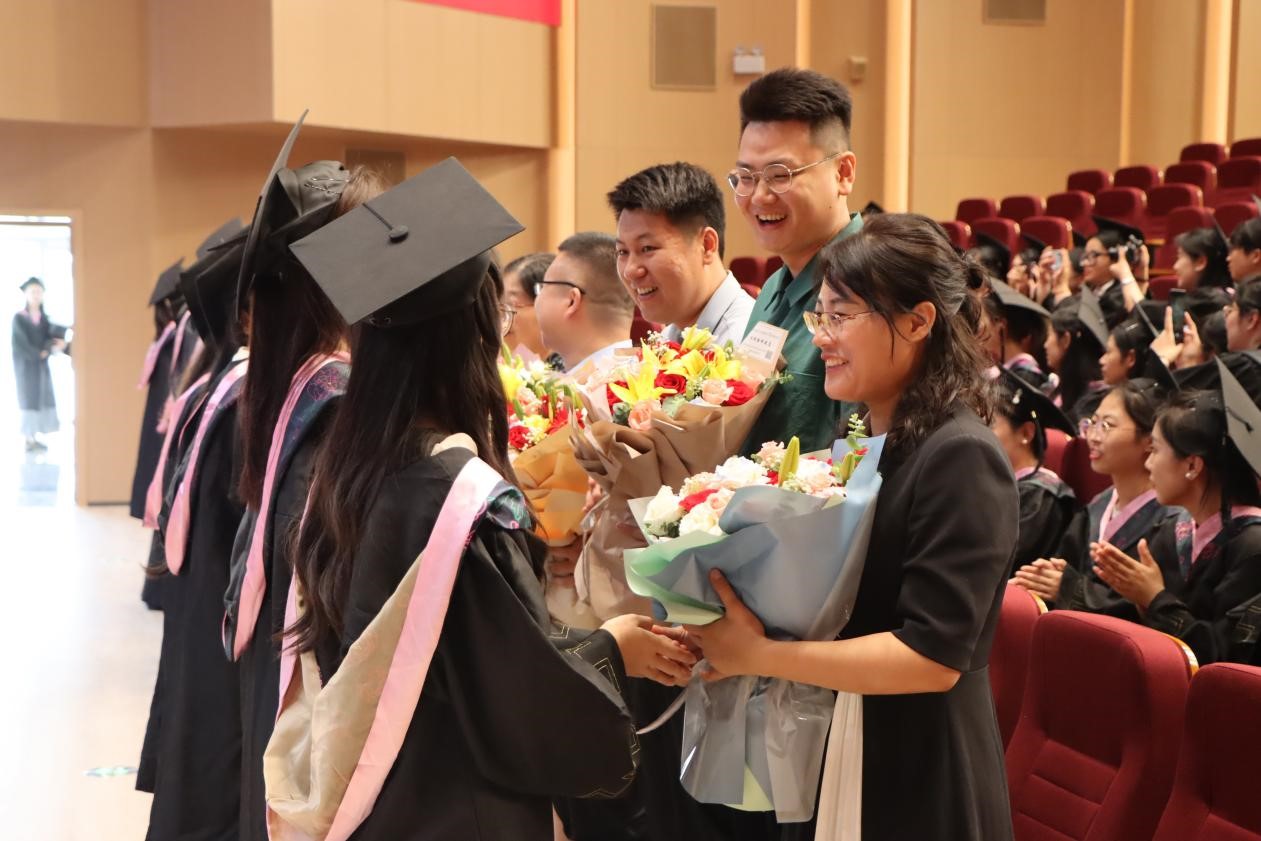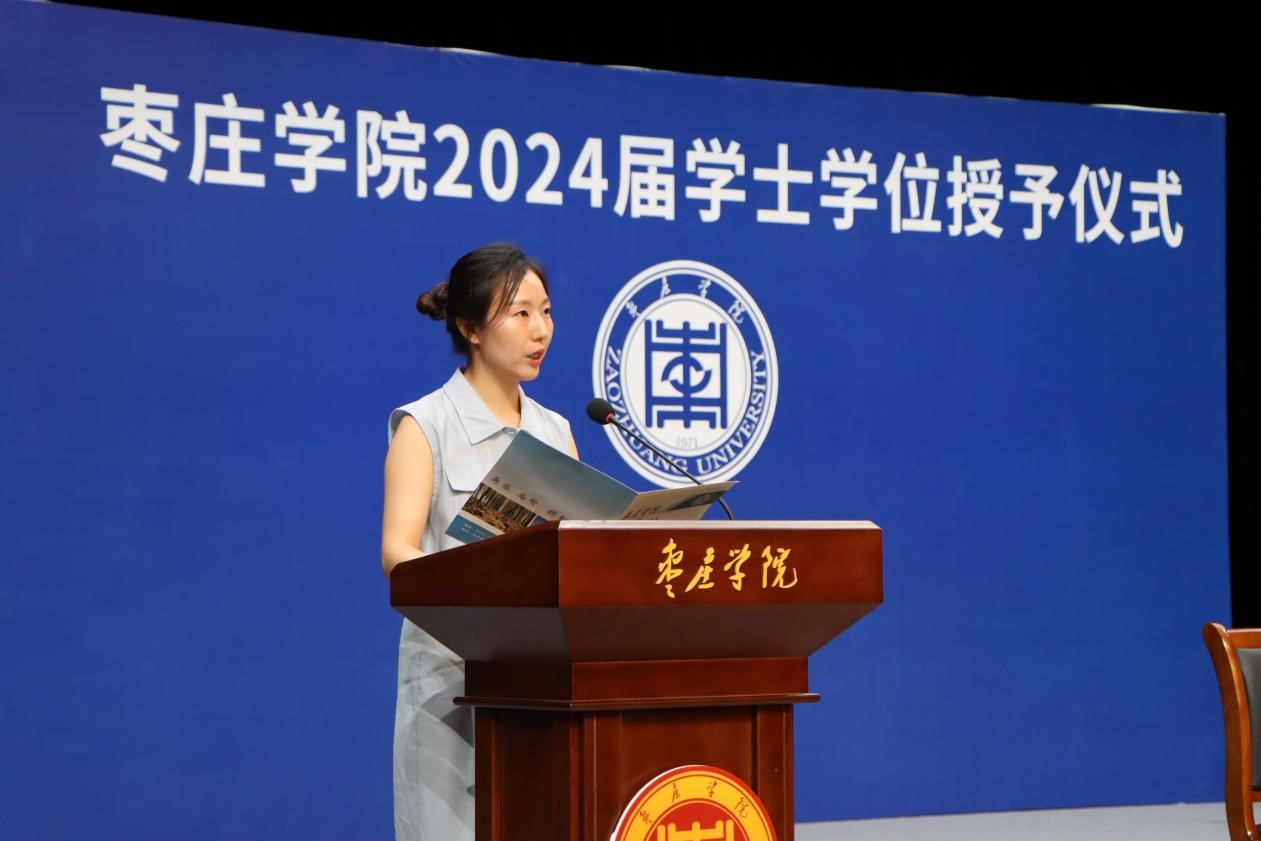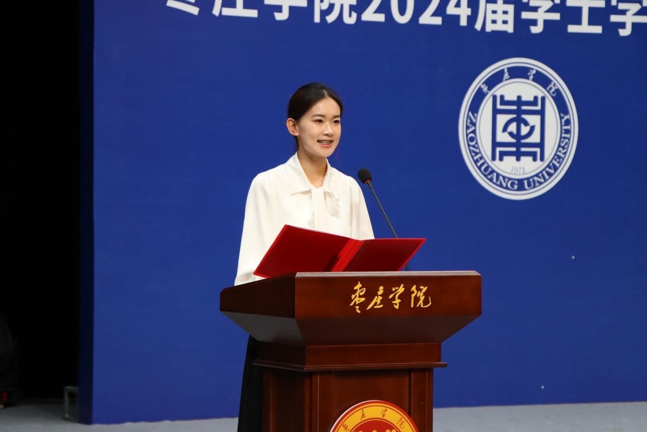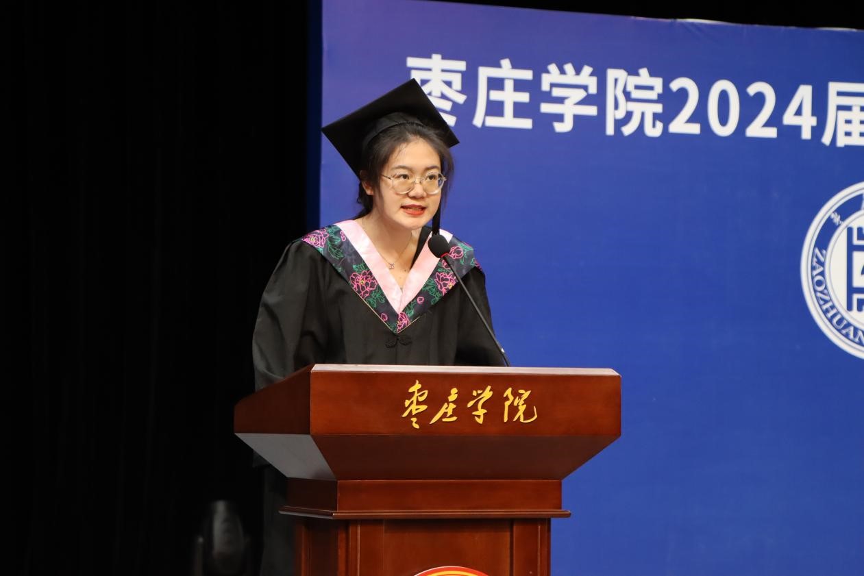 20级汉语言文学本科1班时爱芬作为2024届优秀毕业生代表发言,回顾了在枣院的学习和成长历程,表达了对母校的眷恋不舍和对未来的无限憧憬,并郑重承诺将牢记“兼爱、尚贤、博物、戴行”的校训,做胸怀大志、脚踏实地的人。毕业生代表为教师献上鲜花以表达感激和尊敬之情。
