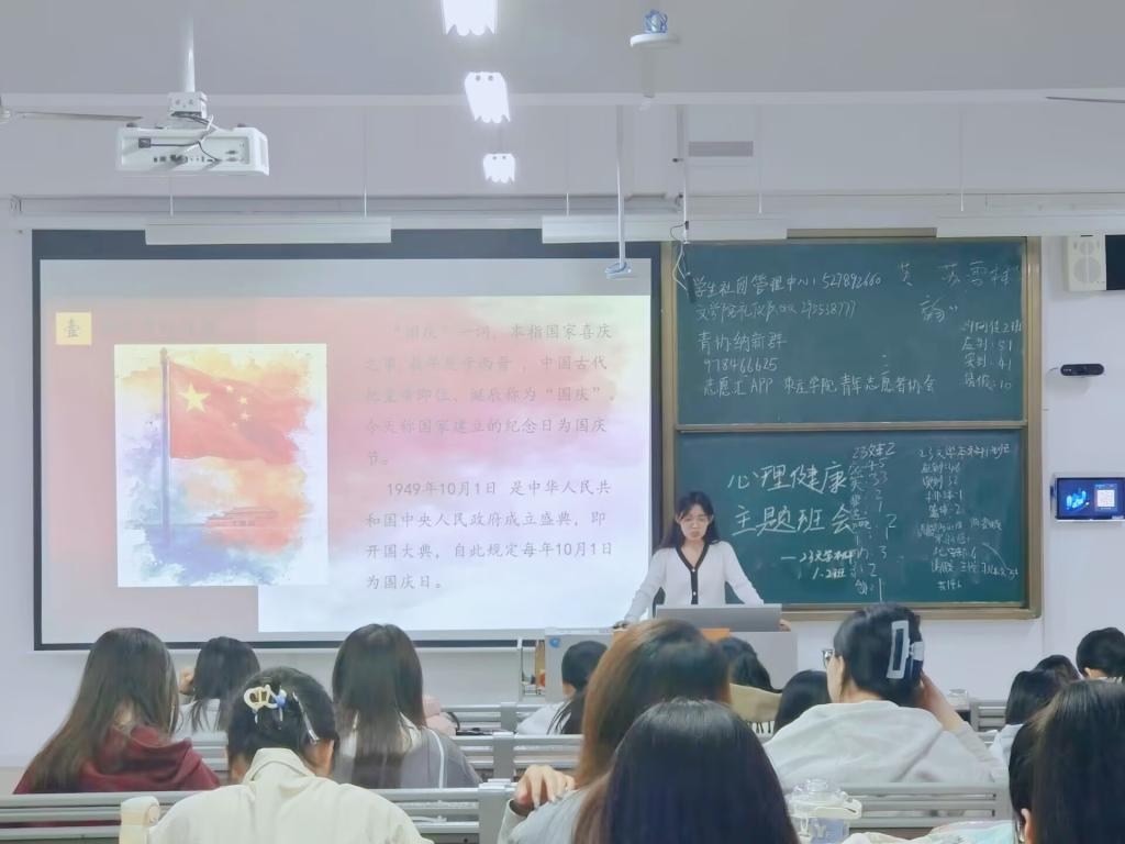 各班级在班会中重点把握了本月内具有重要意义的时间节点,主要围绕国庆节、重阳节、二十四节气以及世界精神卫生日这四个主题进行讨论。部分班级为庆祝国庆节75周年开展了一场红色班会,班会期间由心理委员引导同学们共同演唱《我和我的祖国》,并以老一辈共产党人的英雄事迹作为开场,进而引出新时代青年的责任与担当。随着天气逐渐转凉,有的班级以自身对温度变化的感受为出发点,介绍了寒露与霜降这两个节气的节日体验。另外,有些班级在世界精神卫生日这一关键时间点上,通过小组讨论的方式,让同学们交流了自我调节的方法,并推荐了具有治愈效果的电影。