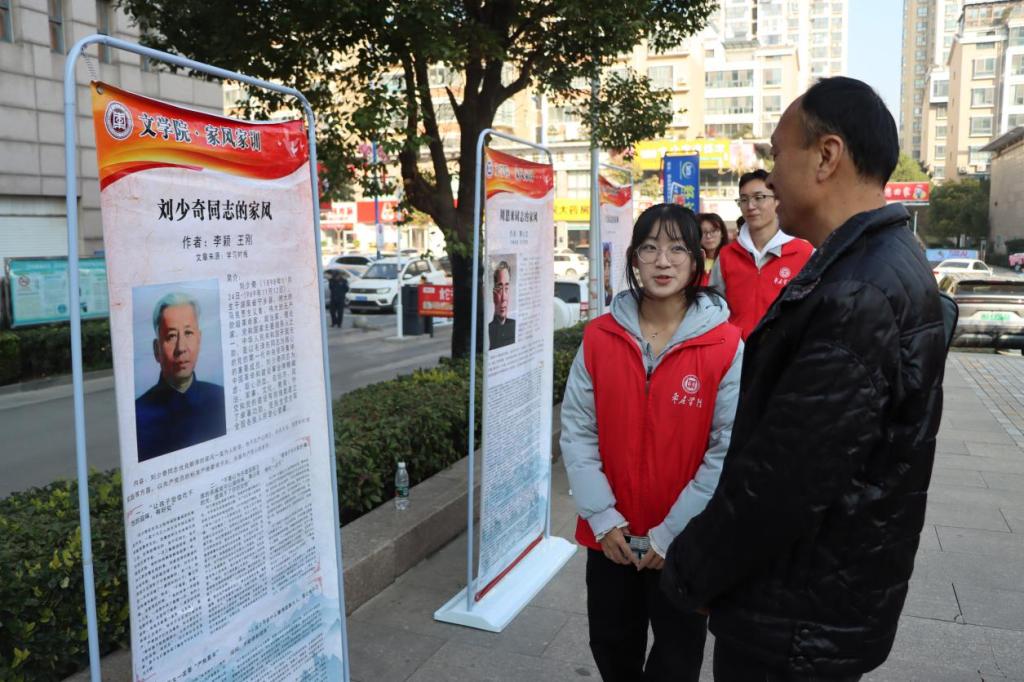 宣讲团在社区内行人密集处摆放易拉宝,采取“集中讲解+分散宣传”方式讲解老一辈革命家毛泽东、朱德、刘少奇、周恩来、陈云、邓小平、习仲勋和古代十大名人的家风家训,宣传汲取他们家风家训的价值内涵和文化精华,帮其家庭树立价值准则。