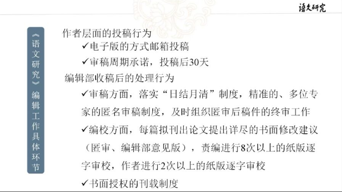 报告中,刘嵚博士从语言学类CSSCI来源期刊《语文研究》简介、办刊经验、编校流程三个方面展开,向同学们具体介绍了《语文研究》的基本情况。同时,就作者层面的投稿行为、编辑部收稿后的处理行为向同学们详细讲解了《语文研究》编辑工作的具体环节。随后,刘嵚博士从期刊责编角度对同学们进行语言类论文写作提出了三点建议,要遵守期刊发文的基本标准、注重期刊论文写作的严谨性、以及个人研究方向的确定与定向积累,并强调以学术创新为底线,使员工们对语言类论文写作有了更深的理解。报告结束后,刘嵚博士耐心解答了同学们关于文章投稿内容等方面的疑问,使同学们更加明确文章投稿要求。最后,史大丰对此次学术报告做了总结发言,对刘嵚博士的分享表示感谢,希望老师和同学们能深入研究,认真思考,学以致用,更好地完成科研工作。