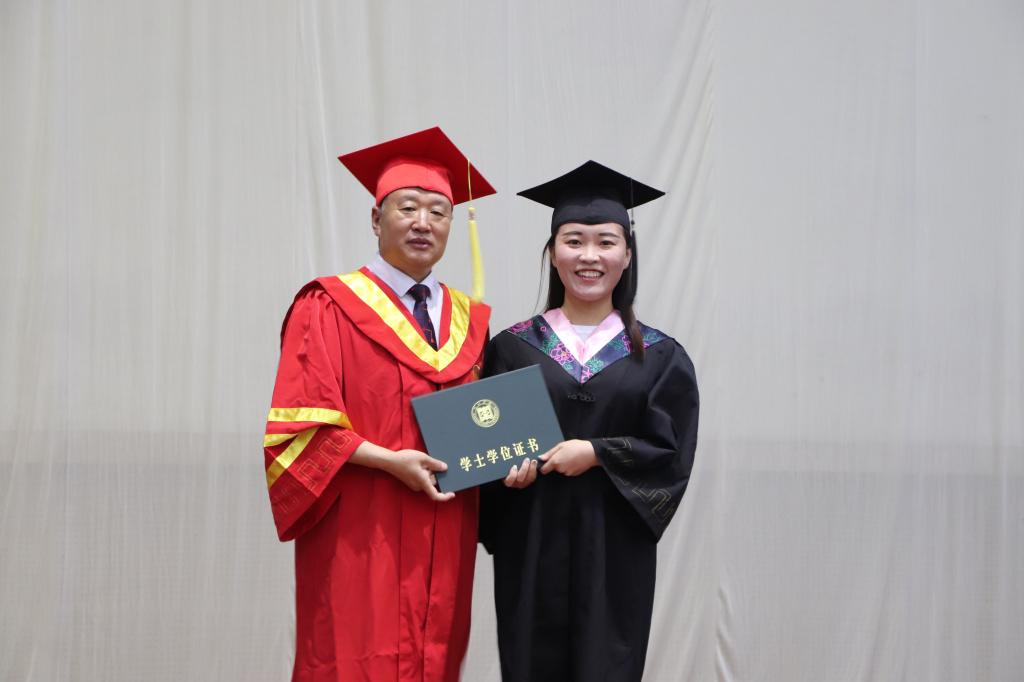 毕业典礼在慷慨激昂的国歌声中拉开了帷幕。李东为毕业生授予学位证书。伴随着欢快的乐曲,毕业生身穿学士服,依次走向主席台,深情地向各位领导、老师鞠躬,感谢母校和老师四年来的辛勤培育。李东董事长亲切地与毕业生握手,帮他们扶正流苏,颁发学位证书,并与毕业生合影留念。
