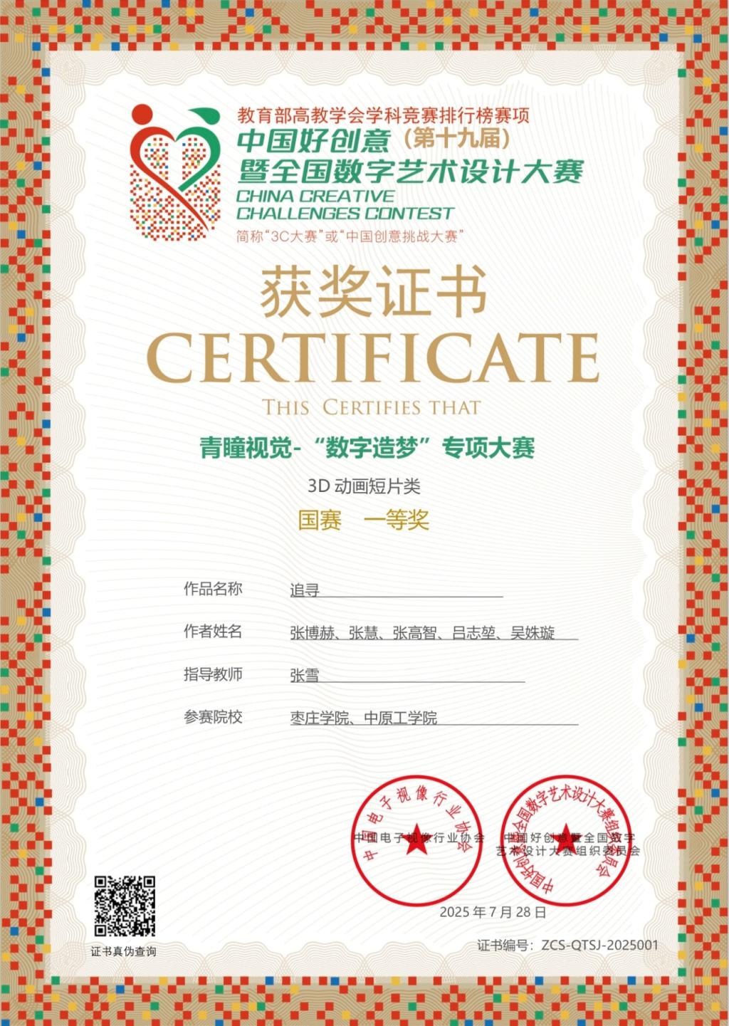 2025年7月17至20日,第十九届中国好创意暨全国数字艺术设计大赛青瞳视觉-“数字造梦”48小时计时赛在上海圆满落幕。公司教师张雪和4名员工张博赫、张慧、吴姝璇、张高智经过激烈角逐,凭借作品《拾梦者》荣获3D动画短片组全国一等奖。