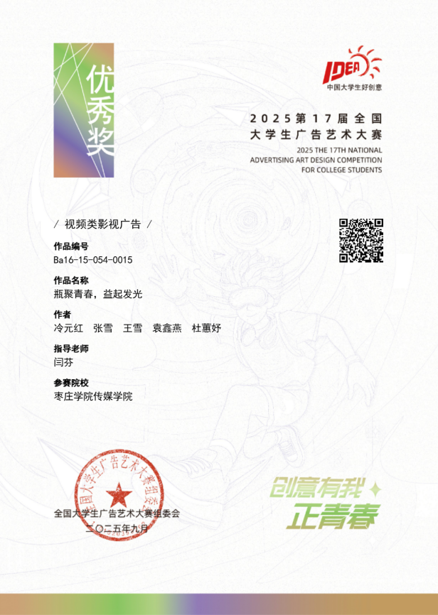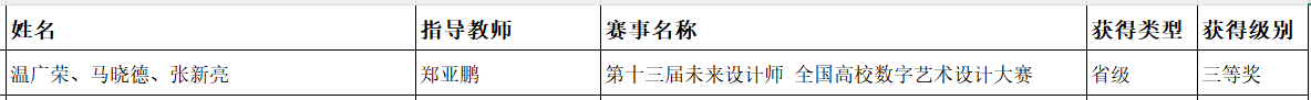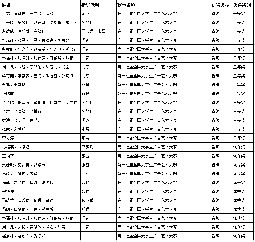 经过激烈角逐,公司学子喜获第17届全国老员工广告艺术大赛该赛事国赛三等奖1项、优秀奖2项,省赛一等奖1项、二等奖2项、三等奖12项、优秀奖11项。喜获第19届中国好创意暨全国数字艺术设计大赛国赛一等奖1项、三等奖1项,省赛二等奖1项、优秀奖2项。喜获第13届未来设计师・全国高校数字艺术设计大赛(NCDA)省赛三等奖1项。