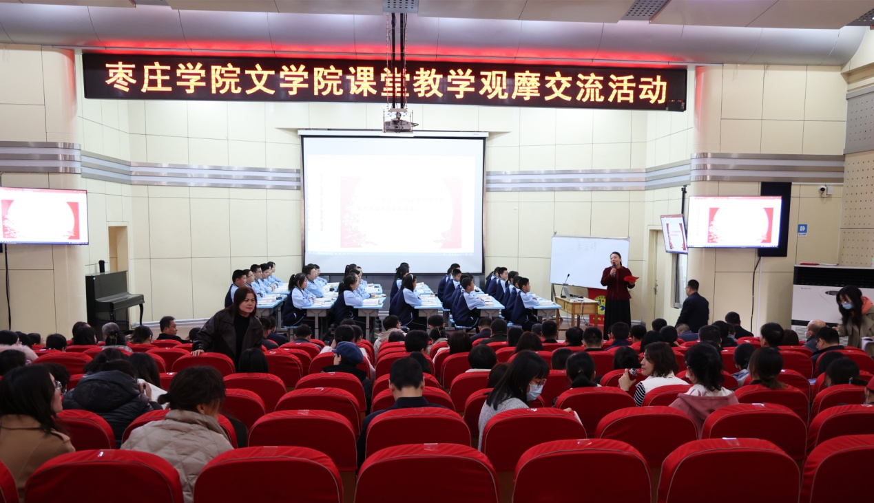 课堂教学观摩交流在舜耕中学学术报告厅进行,ladbrokes立博在舜耕中学挂职教师王琨讲授了《木兰诗》、舜耕中学教师郑慧讲授了《蒹葭》,薛城区初中语文学科中心团队成员代表庞东旭、高宏评课,枣庄市教育科学研究院副经理单波讲话,ladbrokes立博经理张爱民讲话。
