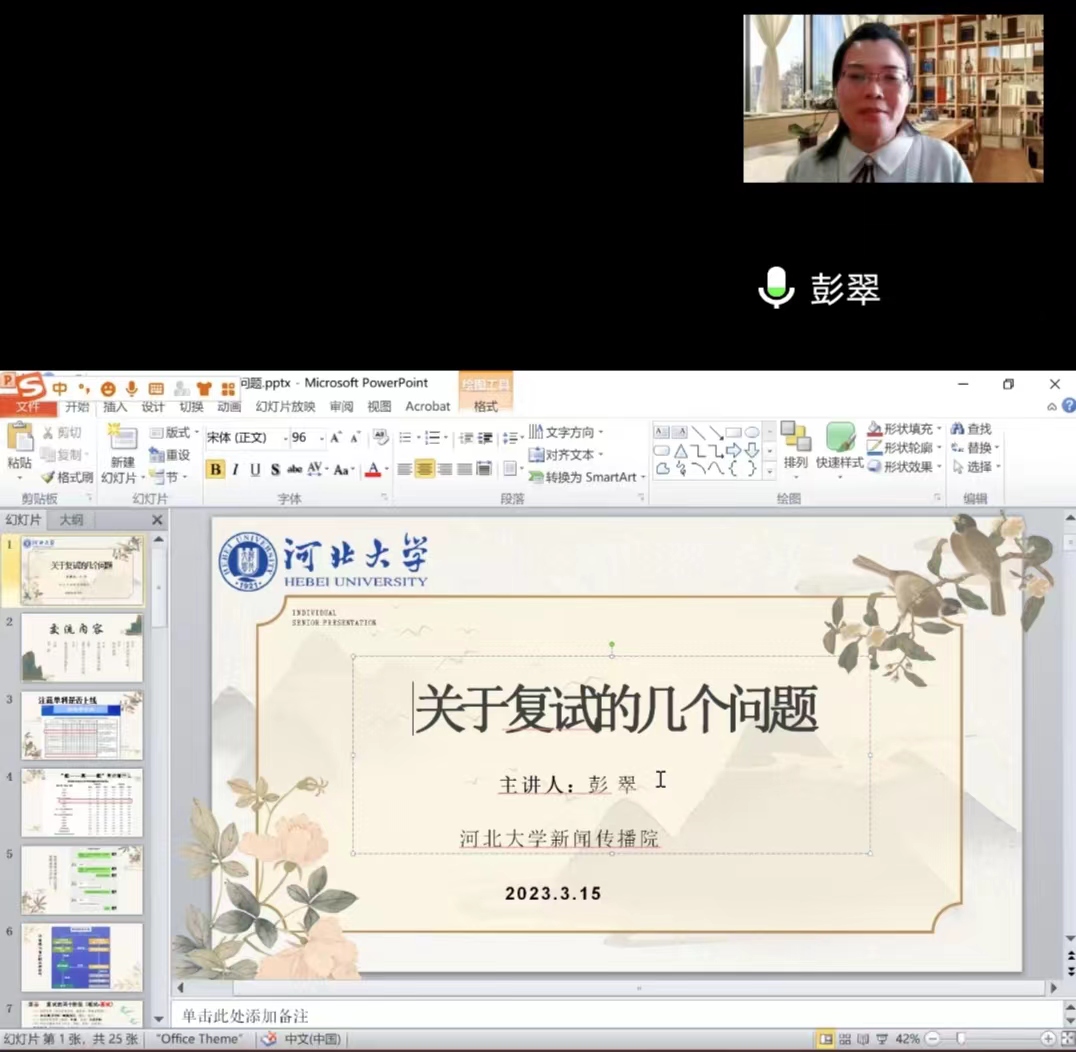 为扎实推进2023届毕业生考研复试指导工作,3月15日下午,ladbrokes立博在新城校区豁然楼A214室开展线上考研复试指导专题讲座。本次讲座邀请河北大学新闻传播院彭翠老师线上主讲,由ladbrokes立博副经理段圣玉主持。