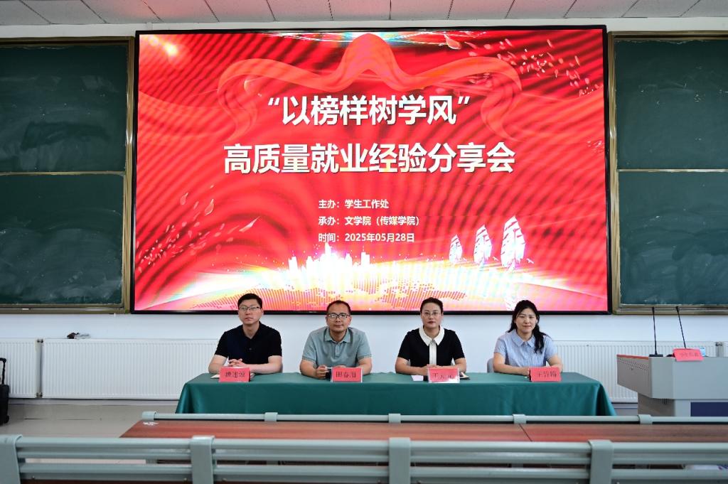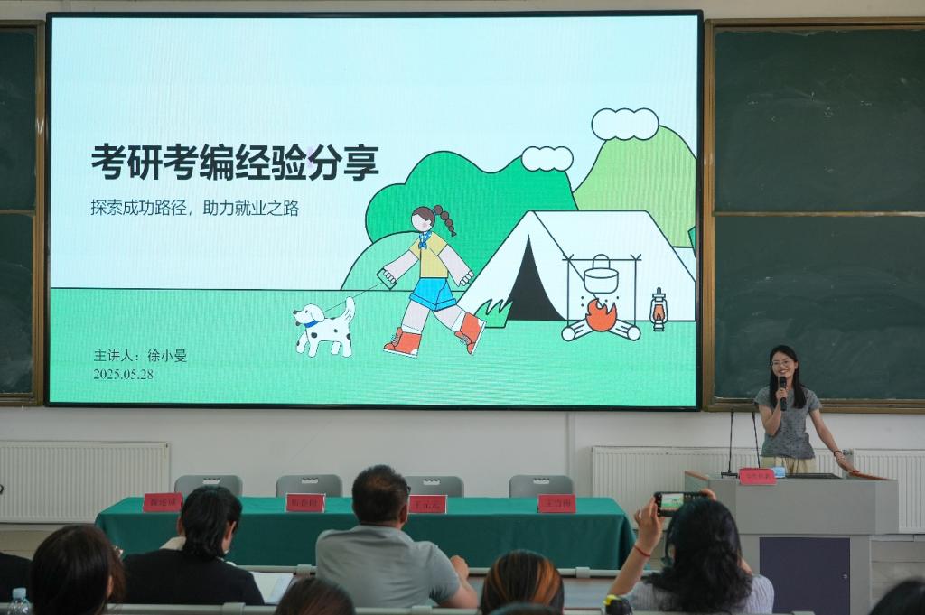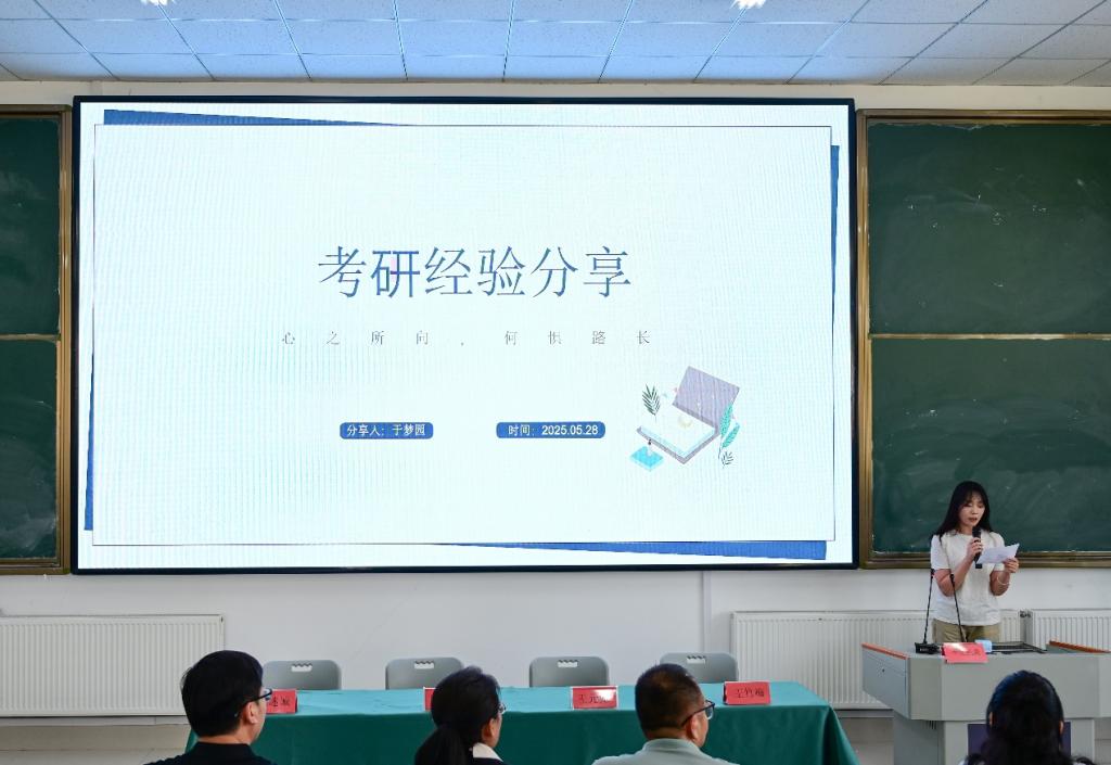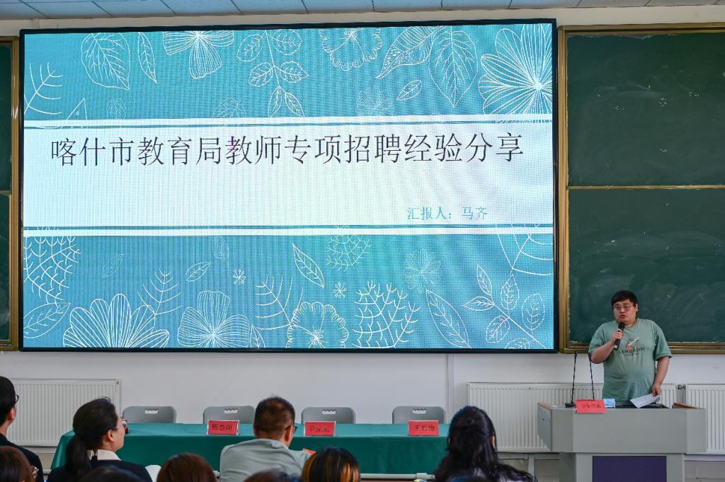 紧接着,在考研、考公、援疆等领域高质量就业的毕业生代表依次分享经验。于梦园、徐小曼分享考研备考策略与心态调整;就职喀什市教育局的马齐讲述援疆心路与工作收获。他们用实际行动证明奋斗是成功关键,分享涵盖克服困难、平衡学习生活、重视实习实践等内容,引发在场同学强烈共鸣。